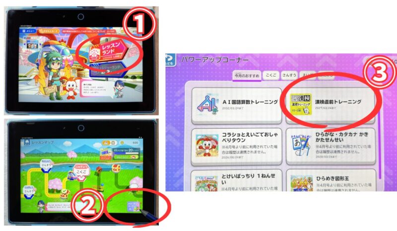 その日のレッスンを完了すると、レッスンマップ右下「パワーアップコーナー」のロックが解除されます(②)。そしてパワーアップコーナーをタップして開くと、「漢検直前トレーニング」を選択できます。